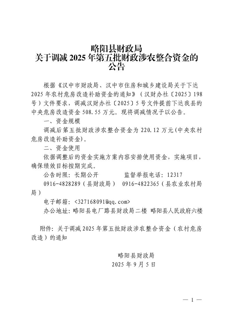| 内容概述 | 略阳县财政局关于调减2025年第五批财政涉农整合资金的公告 | ||||