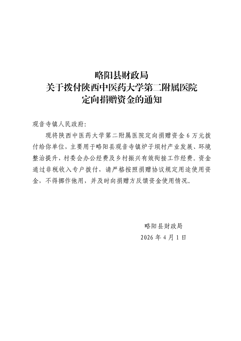 | 内容概述 | 略阳县财政局关于拨付陕西中医药大学第二附属医院定向捐赠资金的通知 | ||||
