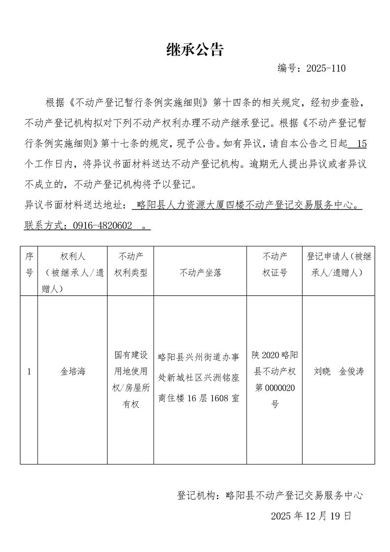 继承公告编号:2025-110