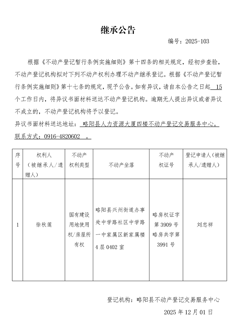 继承公告编号:2025-103