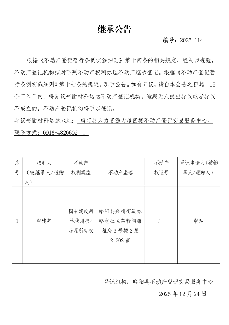 继承公告编号:2025-114