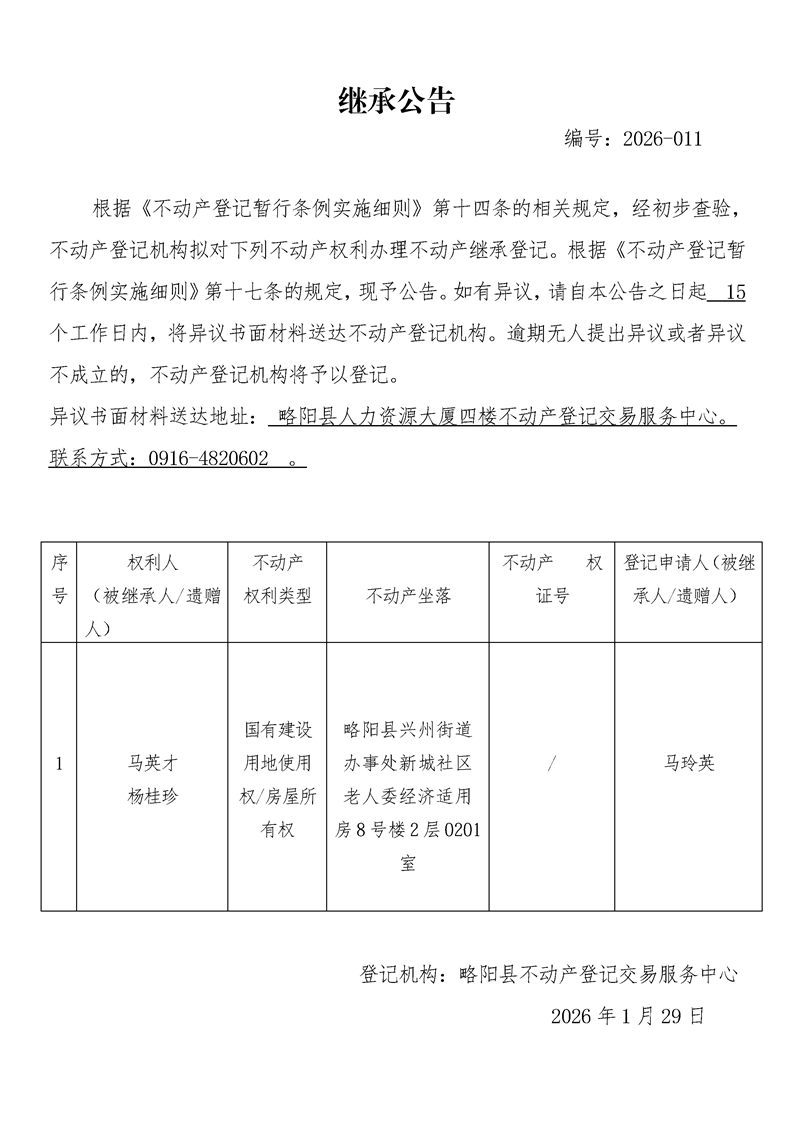 继承公告编号:2026-011