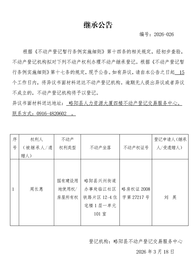 继承公告编号:2026-026
