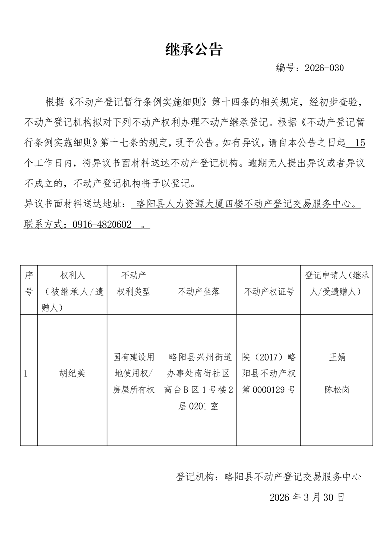 继承公告编号:2026-030