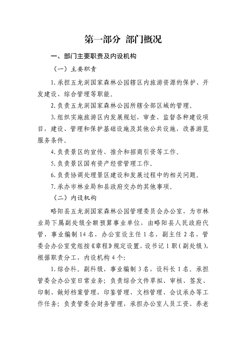 | 内容概述 | 略阳县五龙洞国家森林公园管理委员会办公室2024年度部门决算 | ||||