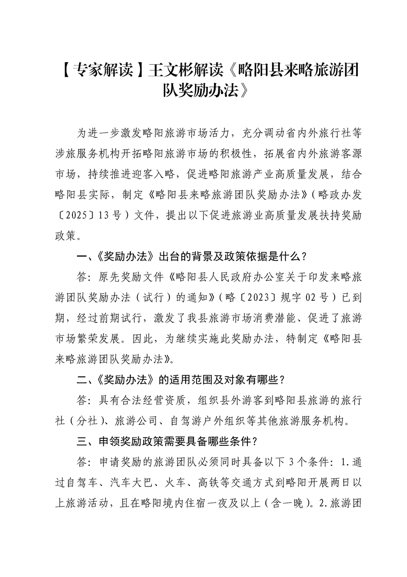 | 内容概述 | 【专家解读】王文彬解读《略阳县来略旅游团队奖励办法》 | ||||