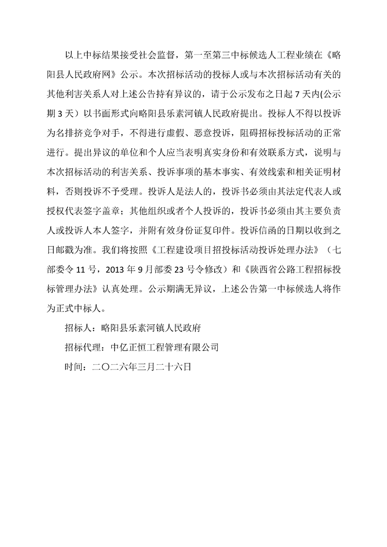 略阳县乐素河镇2026年中央财政以工代赈项目施工招标评标结果公示