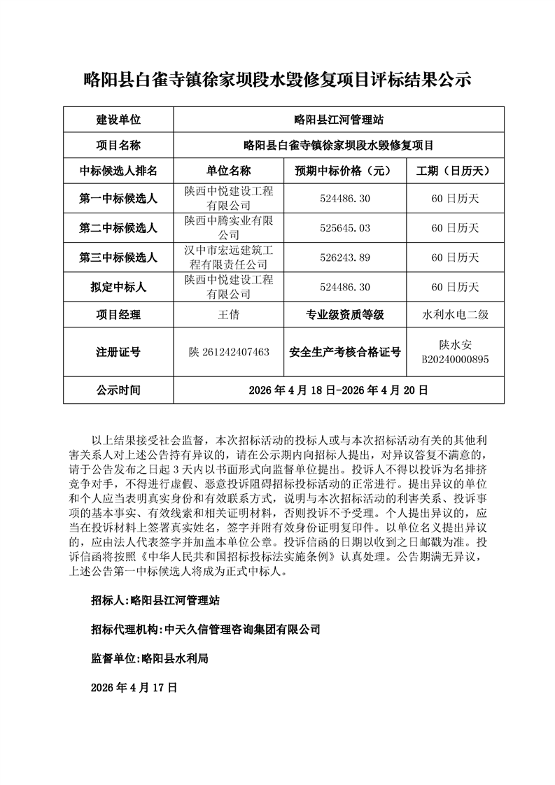 略阳县白雀寺镇徐家坝段水毁修复项目评标结果公示