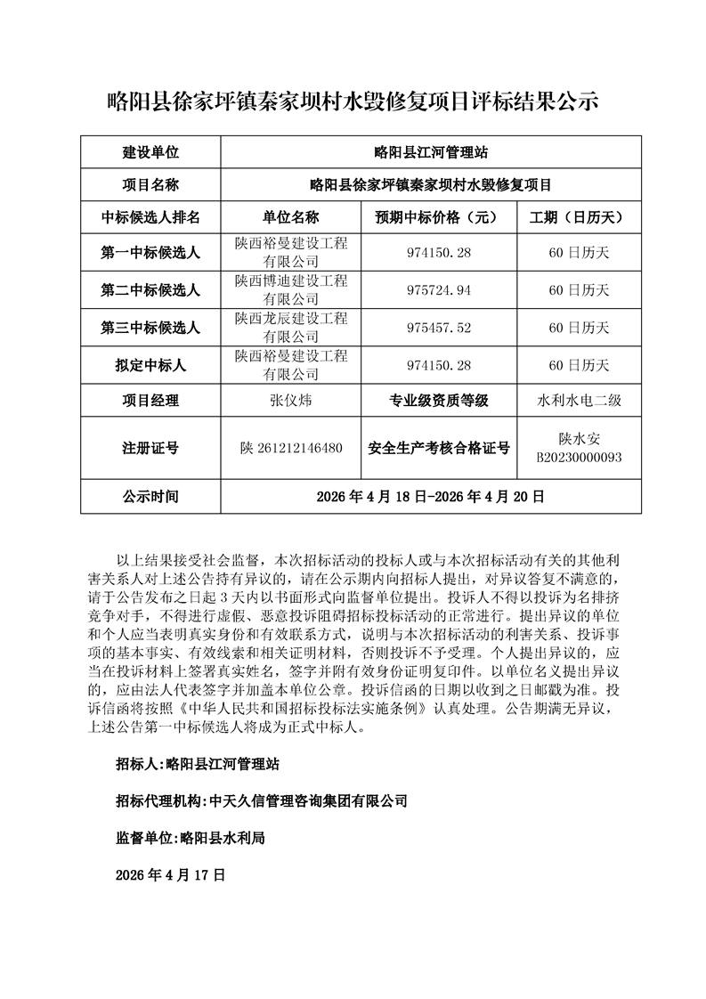 略阳县徐家坪镇秦家坝村水毁修复项目评标结果公示