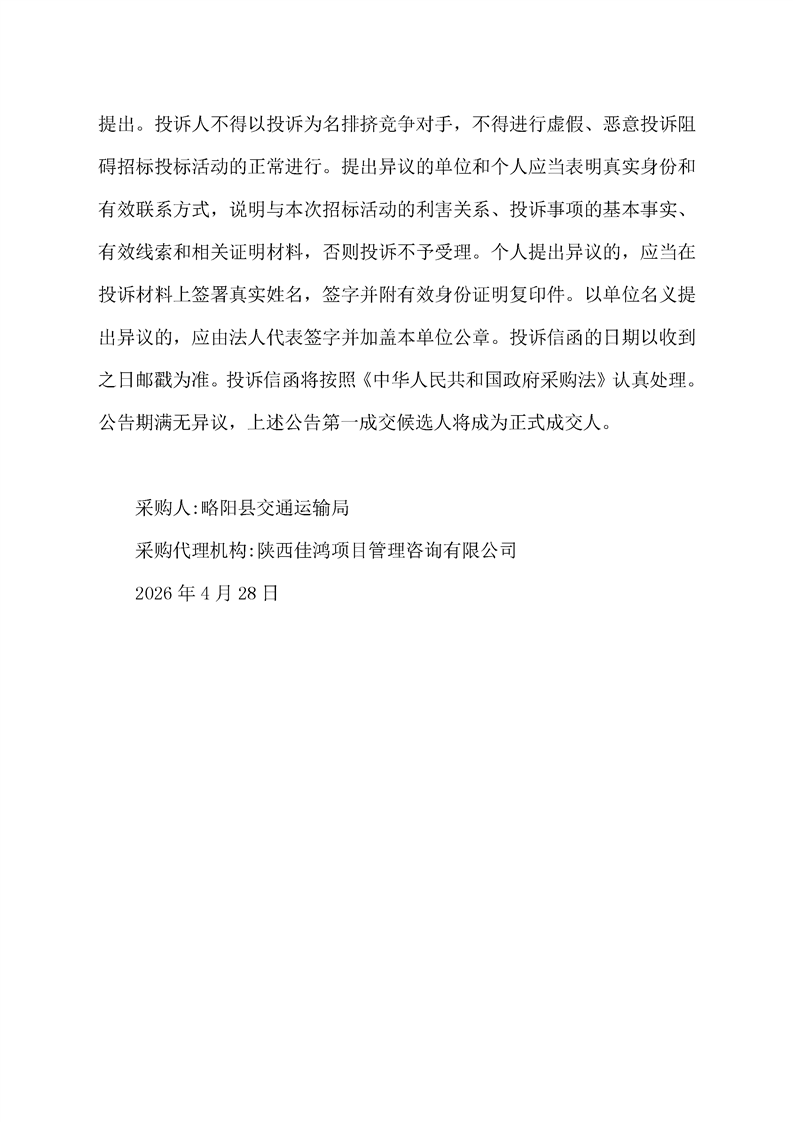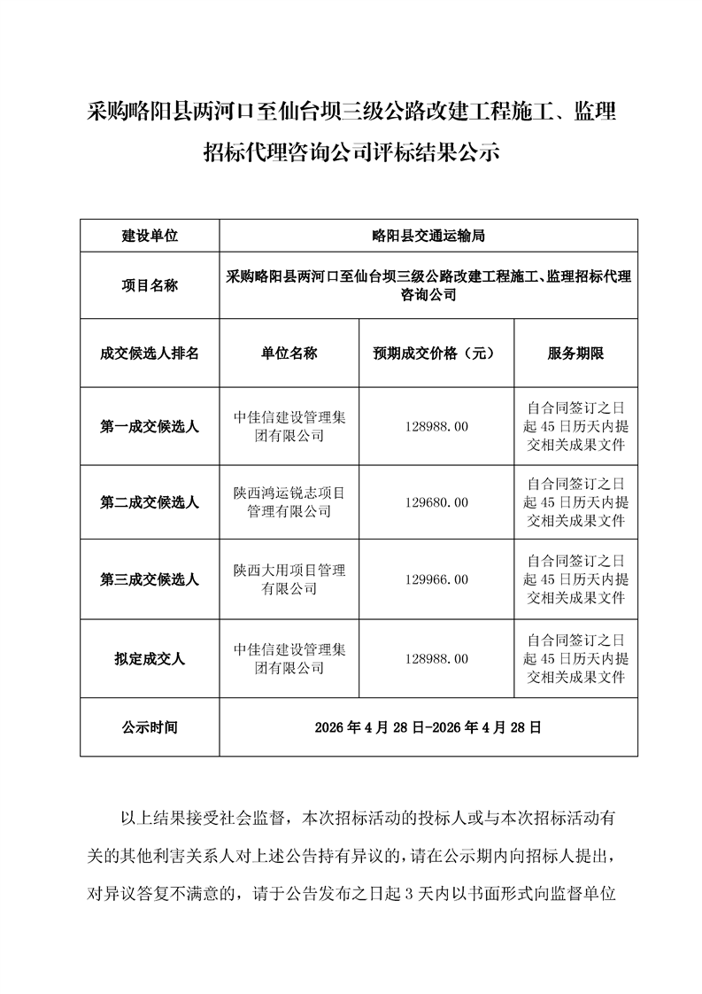 采购略阳县两河口至仙台坝三级公路改建工程施工、监理招标代理咨询公司评标结果公示