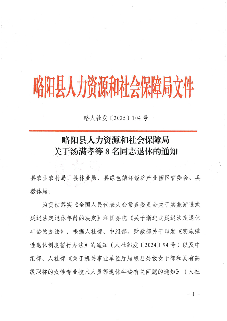 略阳县人力资源和社会保障局关于汤满孝等8名同志退休的通知