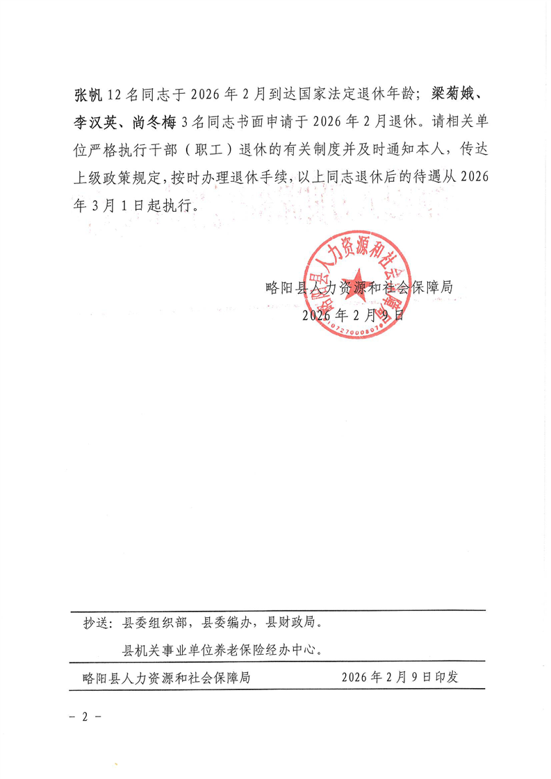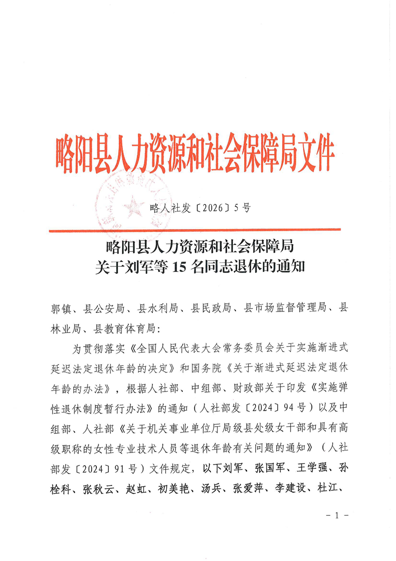 略阳县人力资源和社会保障局关于刘军等15名同志退休的通知