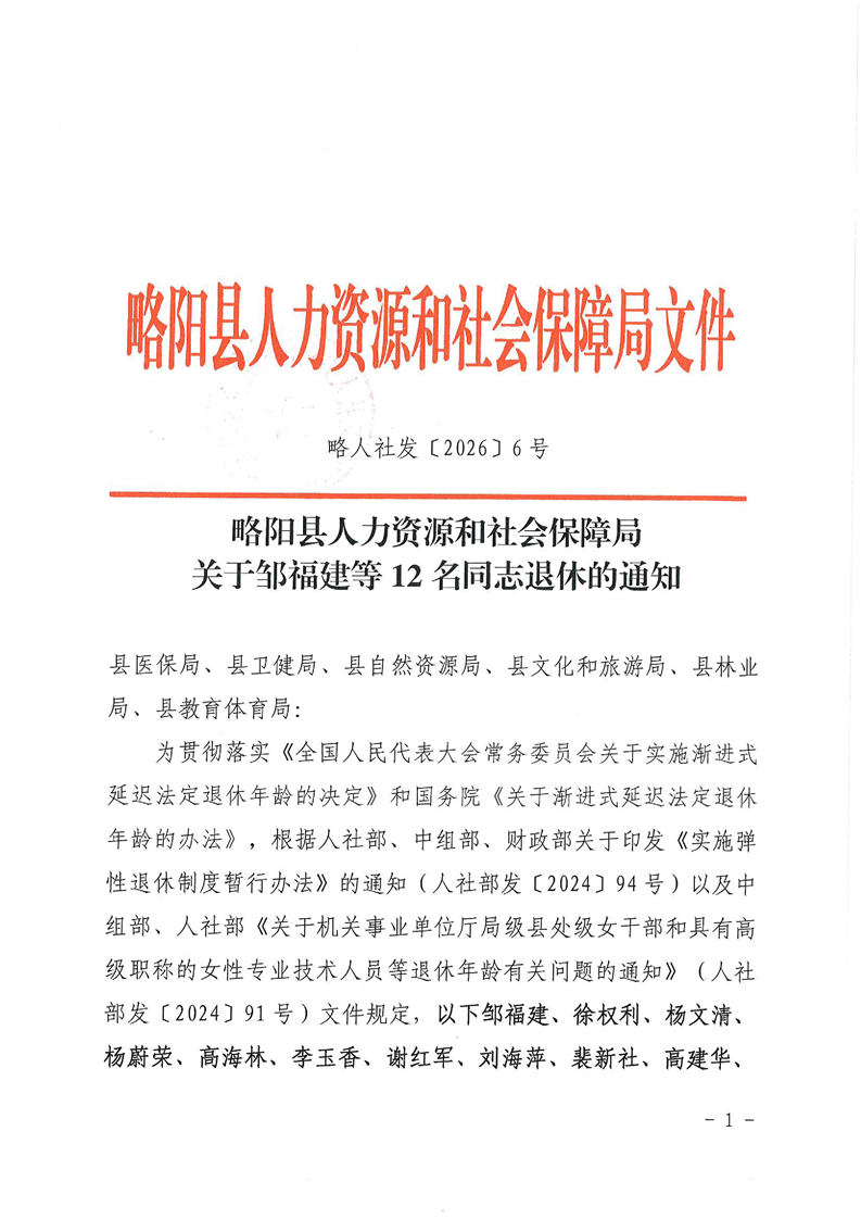 略阳县人力资源和社会保障局关于邹福建等12名同志退休的通知