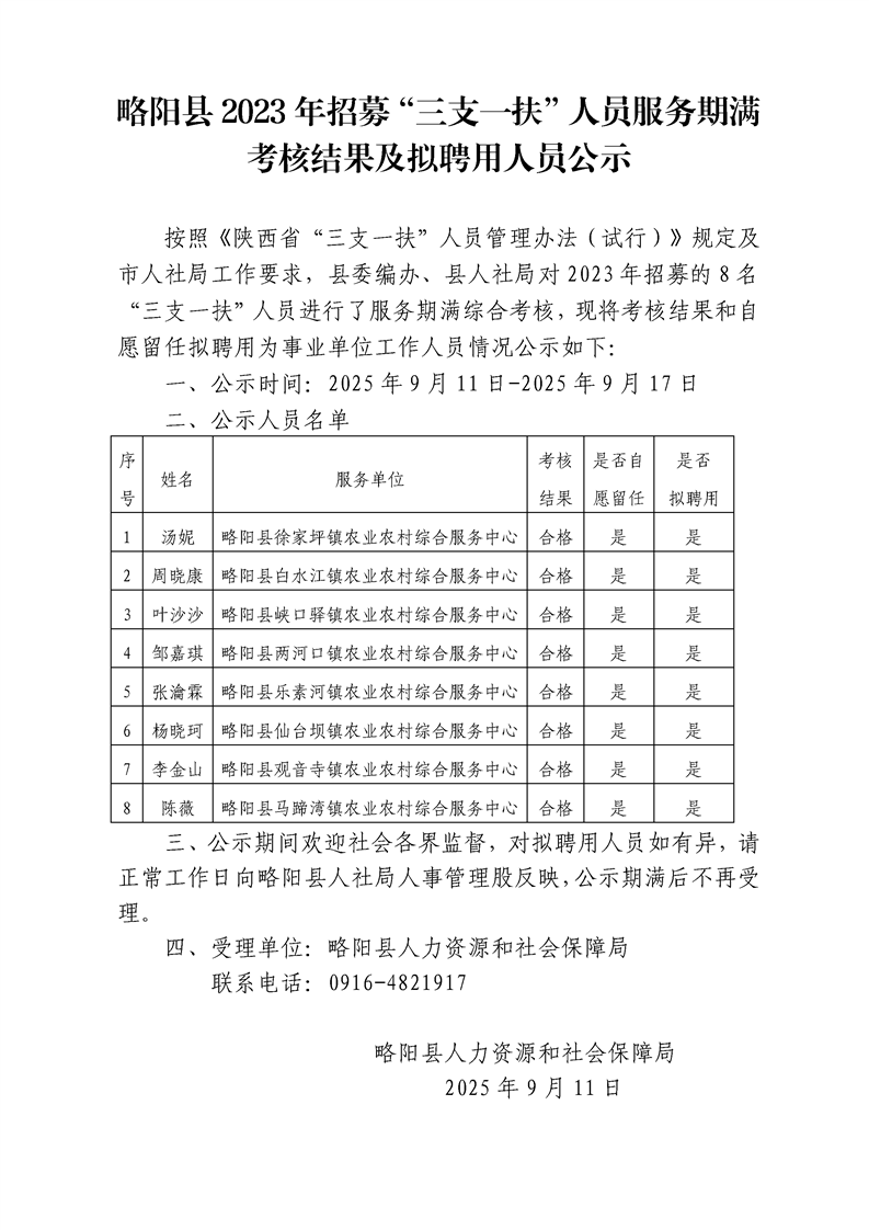 略阳县2023年招募“三支一扶”人员服务期满考核结果及拟聘用人员公示