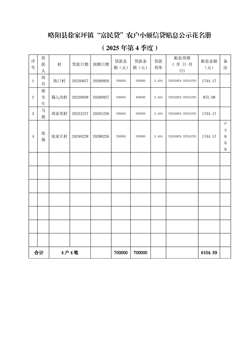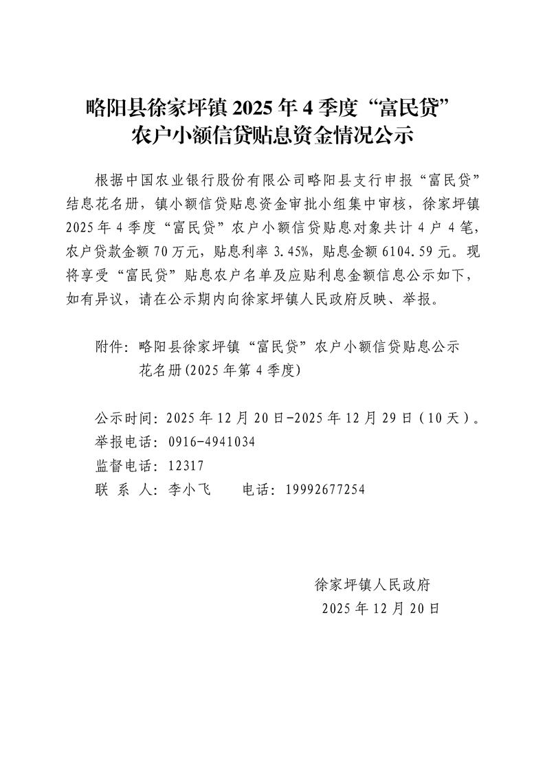 | 内容概述 | 略阳县徐家坪镇2025年4季度“富民贷”农户小额信贷贴息资金情况公示 | ||||