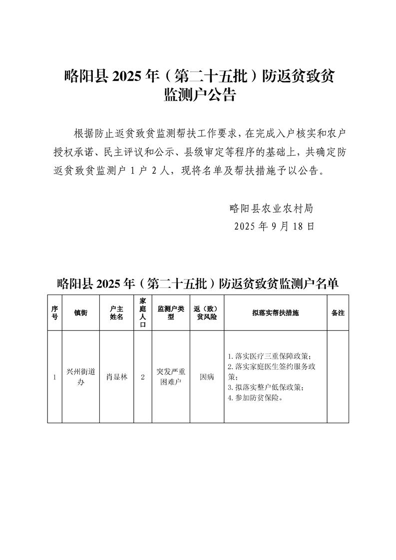 略阳县(第25批)防返贫致贫监测户公告