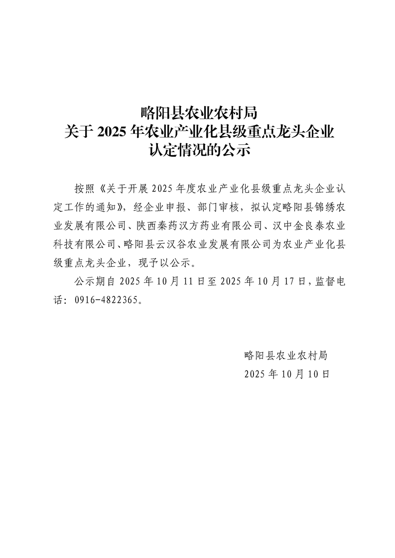 略阳县农业农村局关于2025年度农业产业化县级重点龙头企业认定情况公示