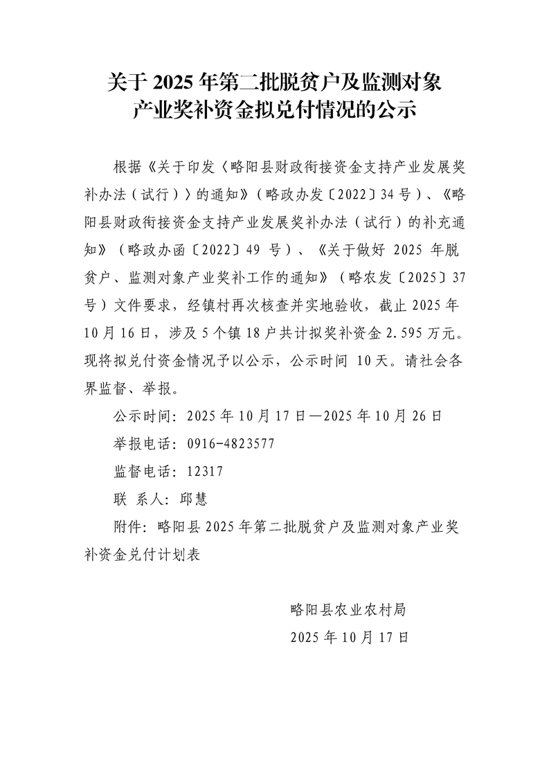 关于2025年第二批脱贫户、监测对象产业奖补资金拟兑付情况的公示