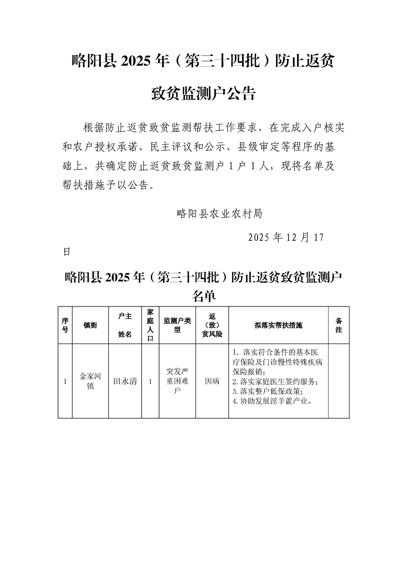 略阳县(第三十四批)防止返贫致贫监测户公告