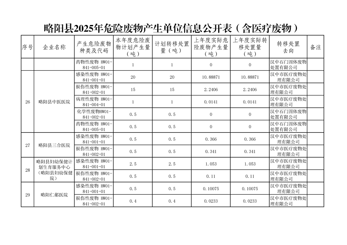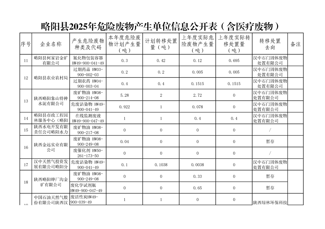 略阳县2025年危险废物产生单位信息公开(含医疗废物)