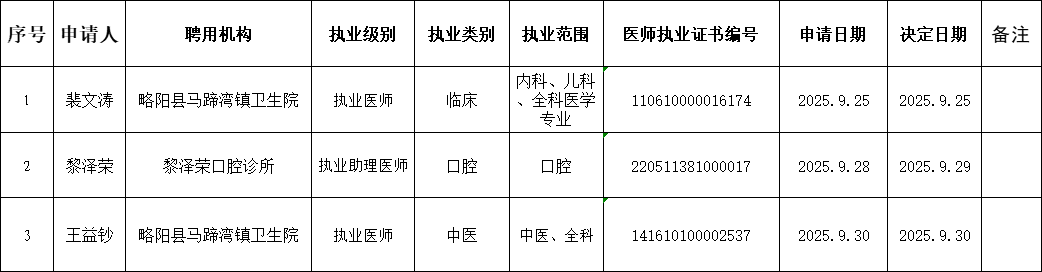 略阳县行政审批服务局医师执业变更信息公开(2025.9.25-2025.9.30)
