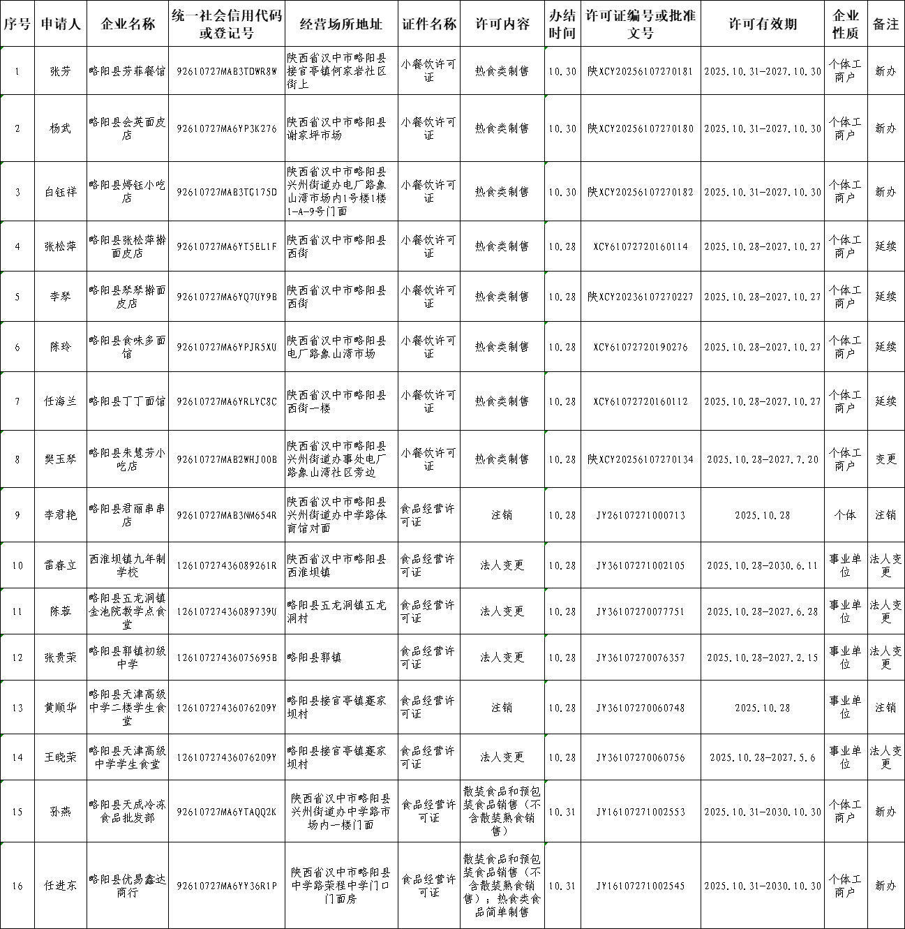 略阳县行政审批服务局餐饮类许可证信息公开(2025.10.28-2025.10.31)