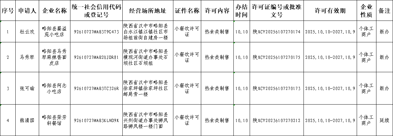略阳县行政审批服务局餐饮类许可证信息公开(2025.10.11)