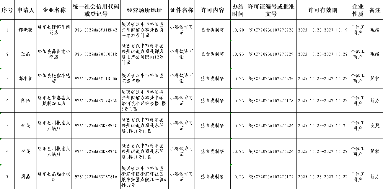 略阳县行政审批服务局餐饮类许可证信息公开(2025.10.20-2025.10.23)