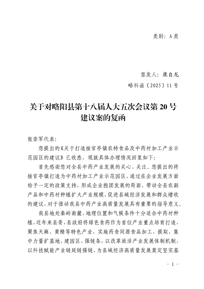 关于对略阳县第十八届人大五次会议第20号建议案的复函