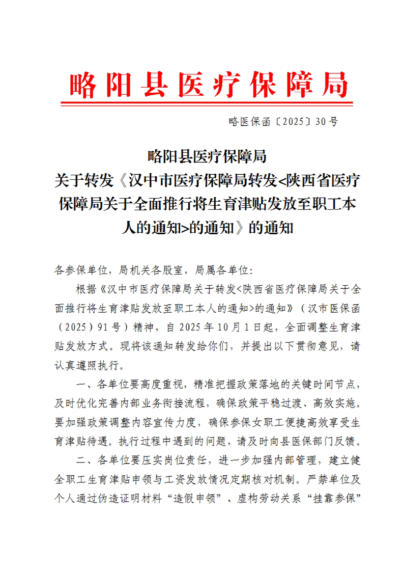 关于转发《汉中市医疗保障局转发陕西省医疗保障局关于全面推行将生育津贴发放至职工本人的通知的通知》的通知