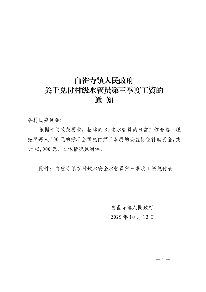 白雀寺镇人民政府关于兑付村级水管员第三季度工资的通知