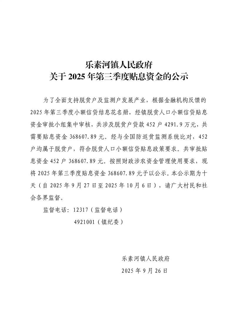 乐素河镇人民政府关于2025年第三季度贴息资金公示