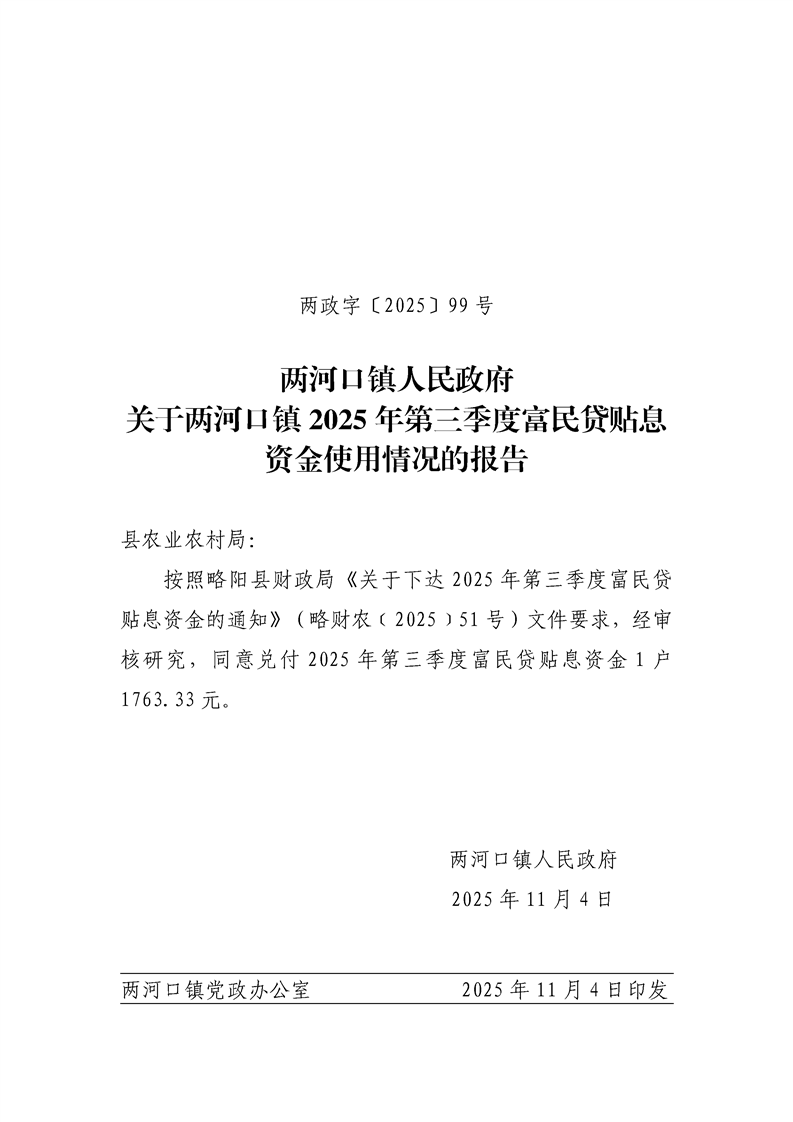 两河口镇人民政府关于两河口镇2025年第三季度富民贷贴息资金使用情况的报告