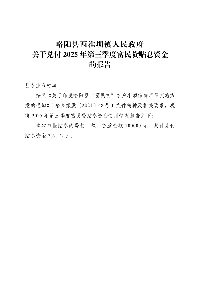 关于兑付2025年第三季度富民贷贴息资金的报告