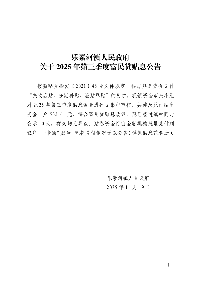 乐素河镇人民政府关于2025年第3季度富民贷贴息公告
