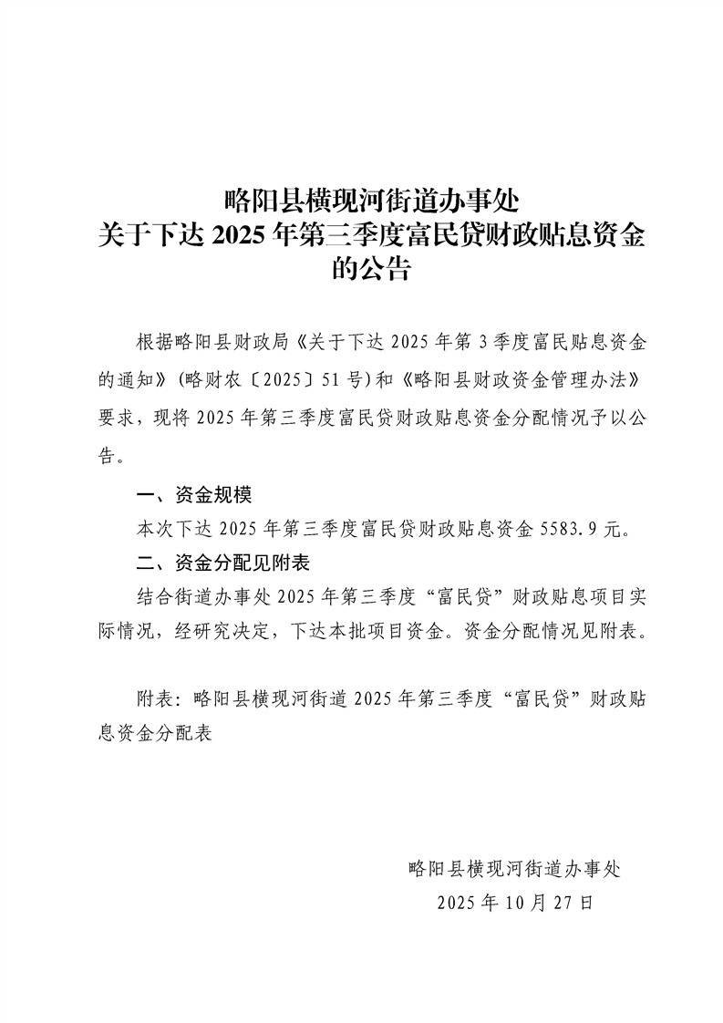略阳县横现河街道办事处关于下达 2025 年第三季度富民贷财政贴息资金的公告