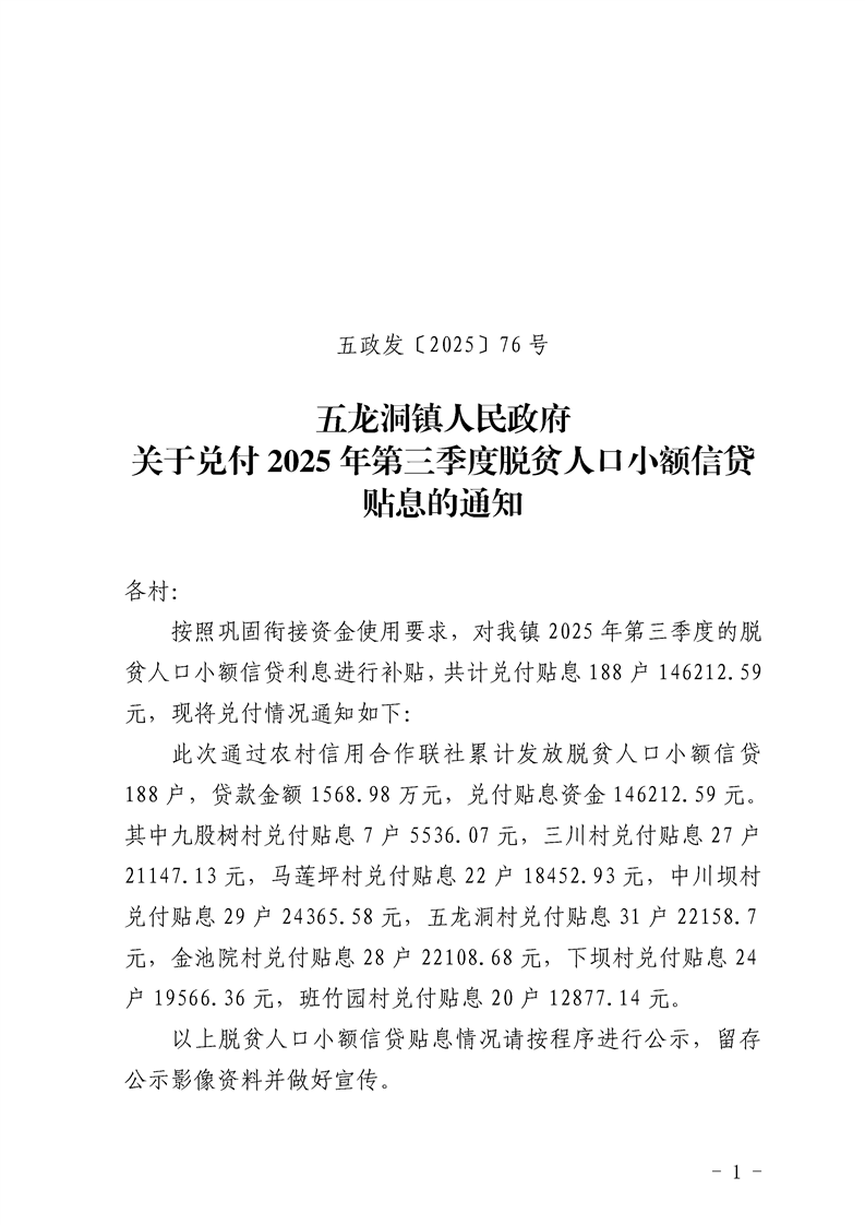 五龙洞镇人民政府关于兑付2025年第三季度脱贫人口小额信贷贴息的通知