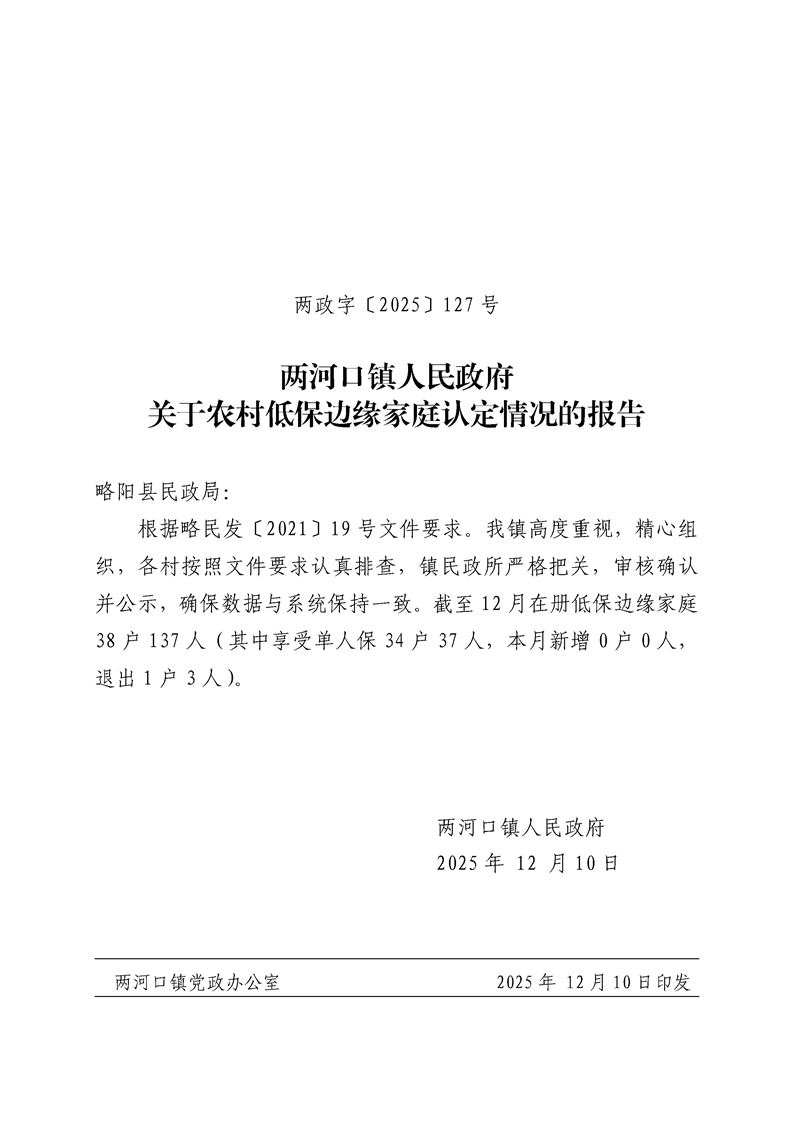 两河口镇人民政府关于农村低保边缘家庭认定情况的报告