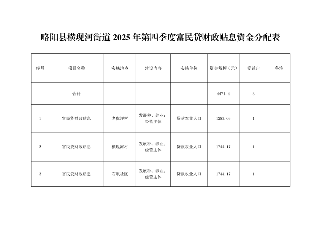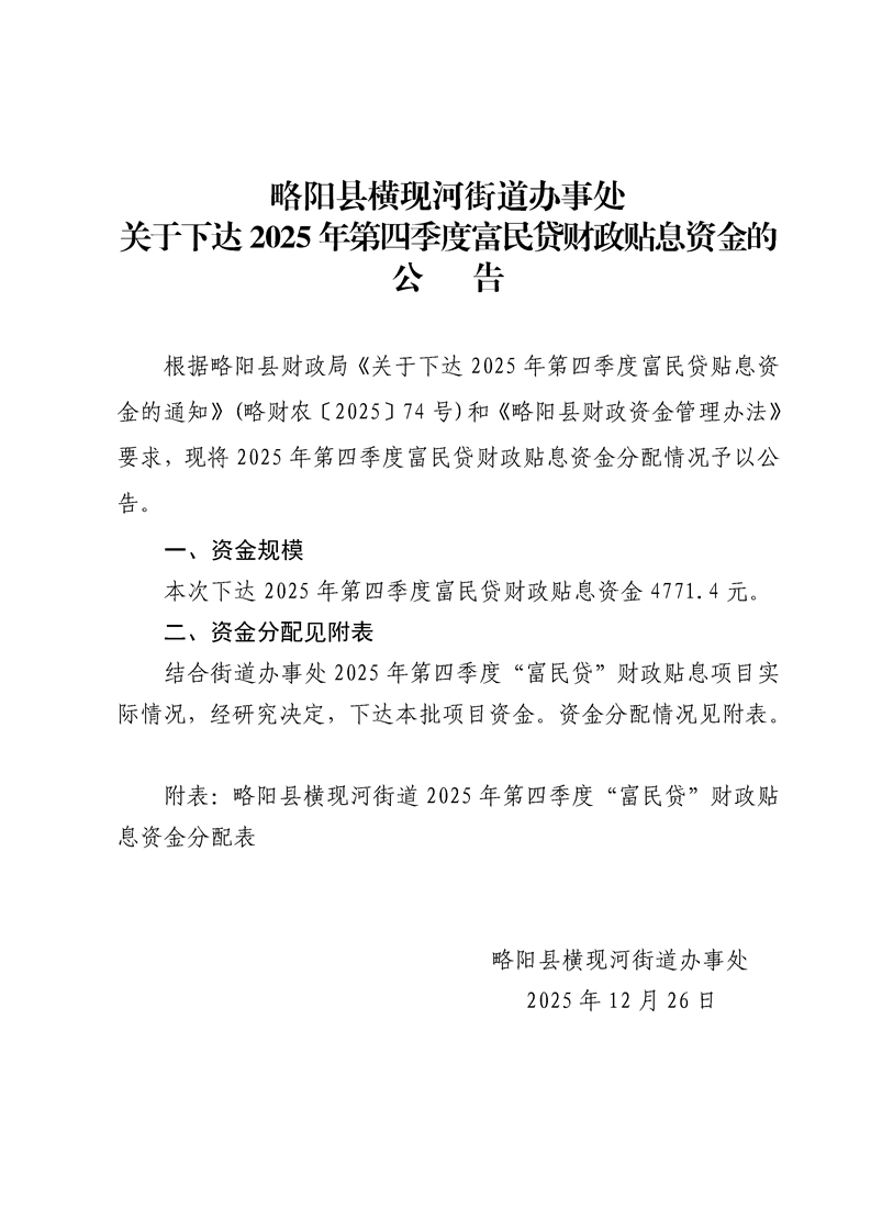 横现河街道办事处关于下达2025年第四季度富民贷财政贴息资金的公告