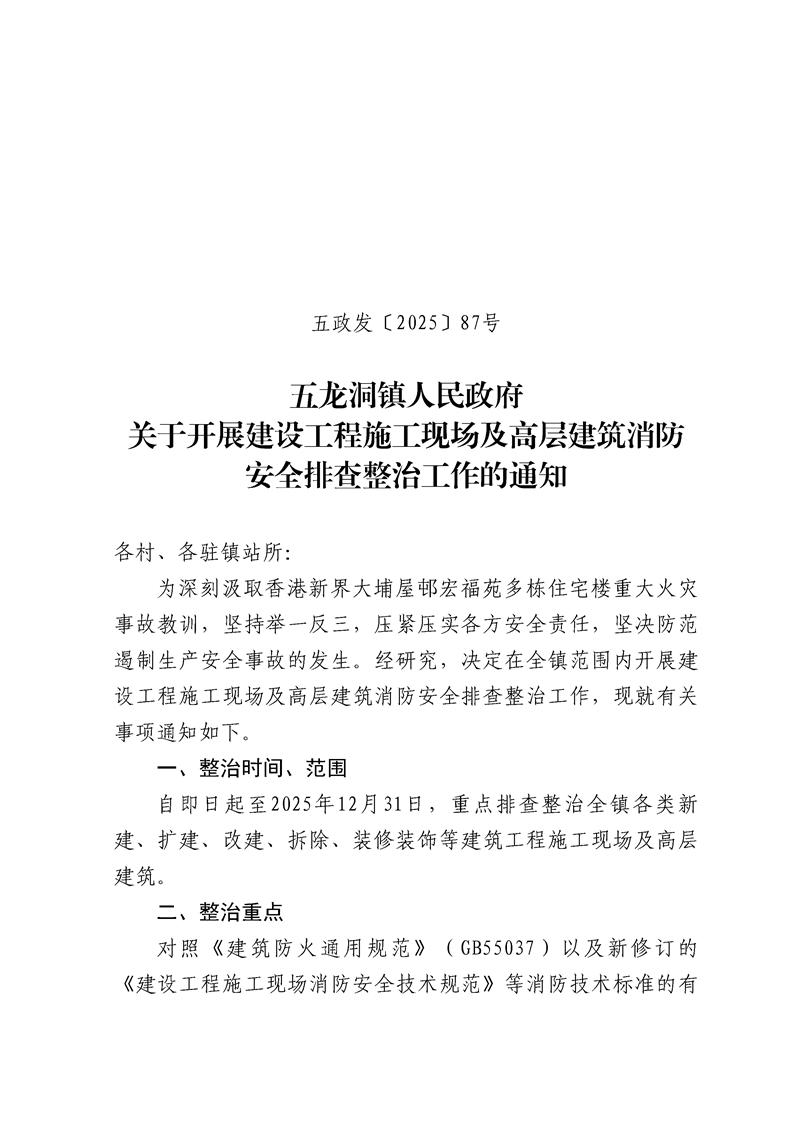 五龙洞镇人民政府关于开展建设工程施工现场及高层建筑消防安全排查整治工作的通知