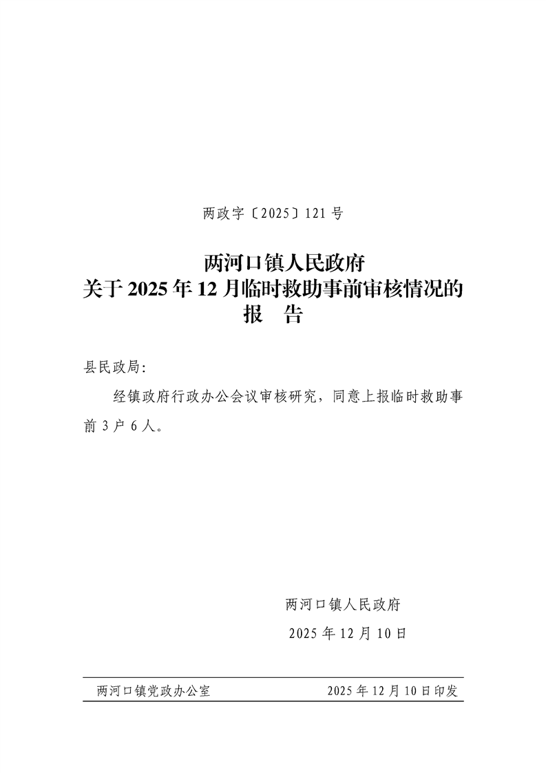 两河口镇人民政府关于2025年12月临时救助事前审核情况的报告