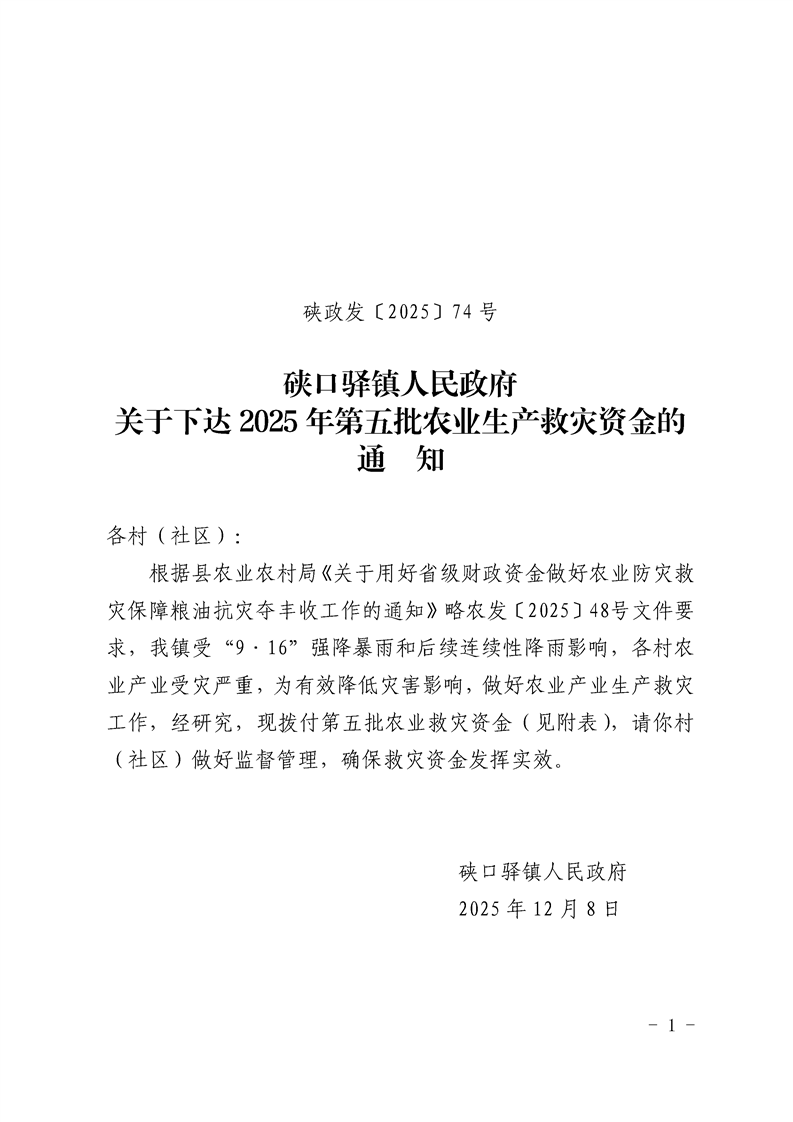 硖口驿镇人民政府关于下达2025年第五批农业生产救灾资金的通知