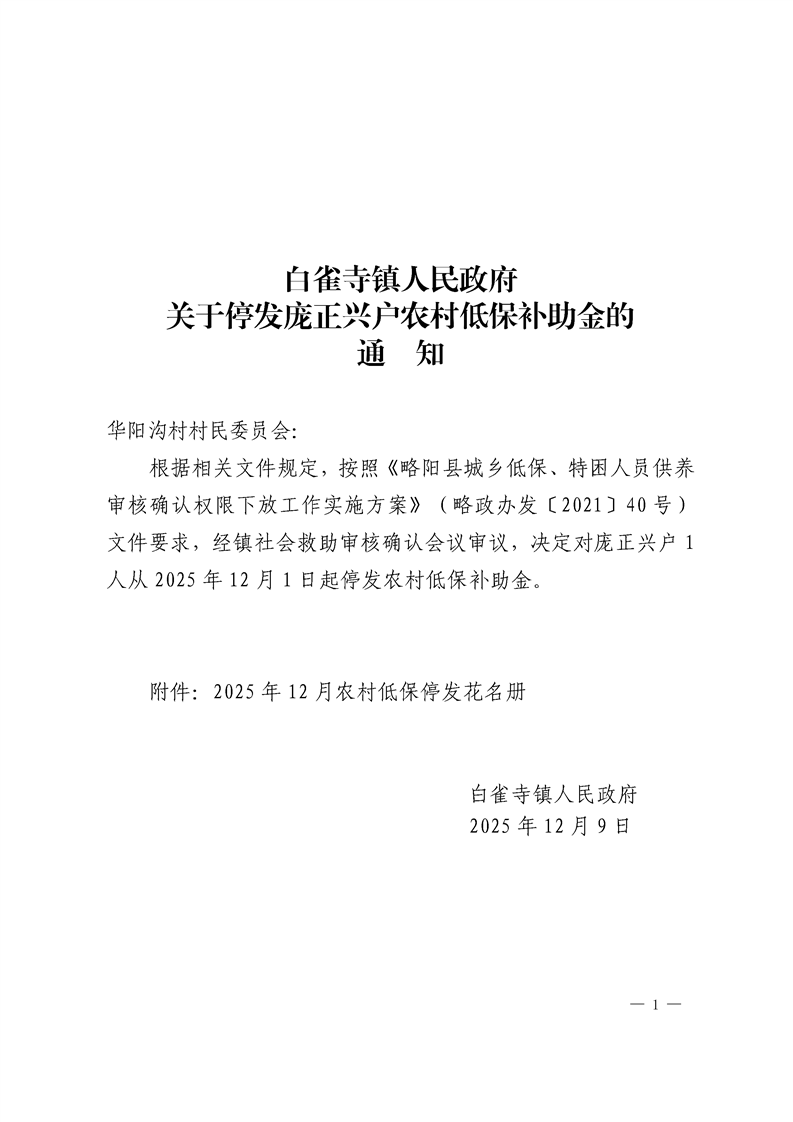 白雀寺镇人民政府关于停发庞正兴户农村低保补助金的通知