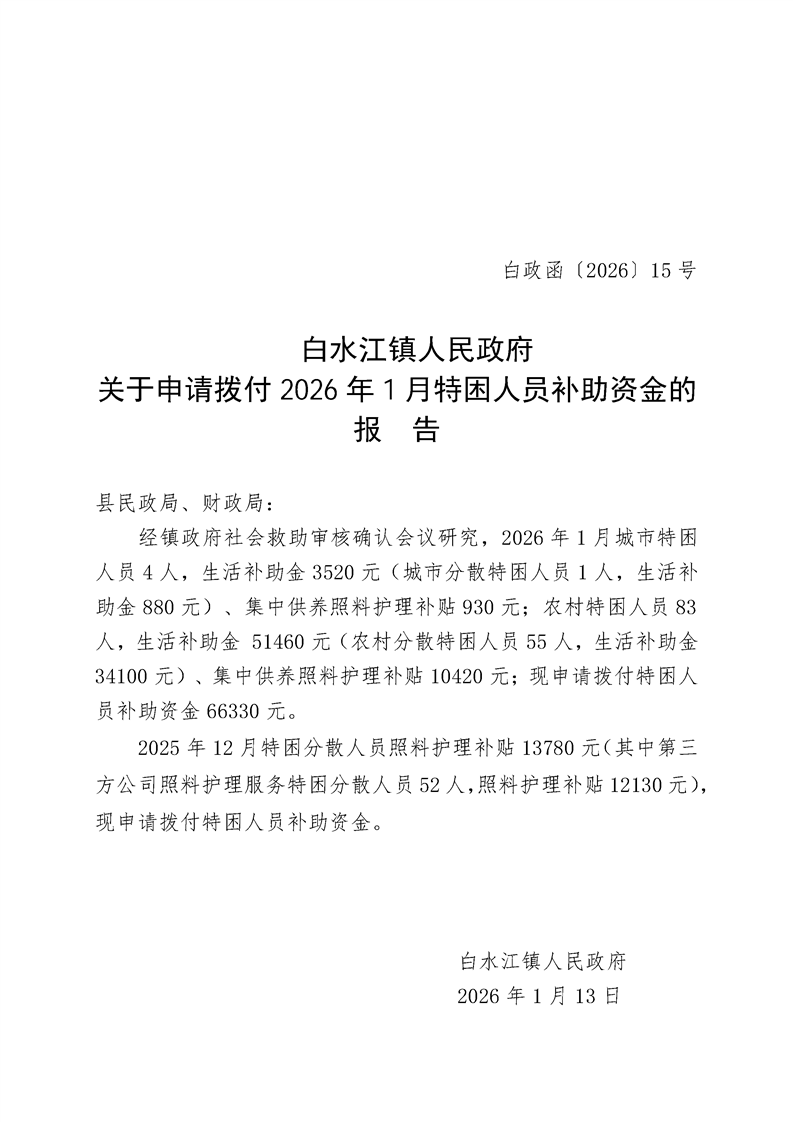 白水江镇人民政府关于申请拨付2026年1月特困人员补助资金的报告