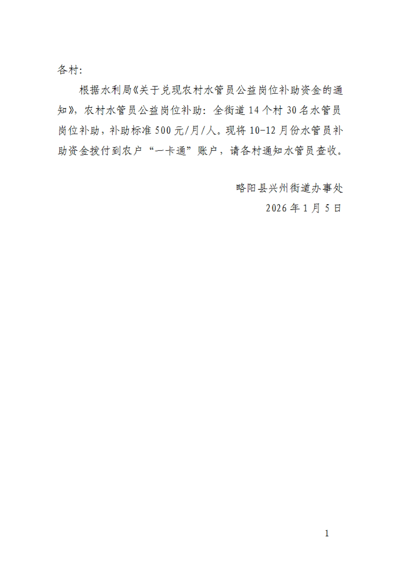 略阳县兴州街道办事处关于兑现农村水管员公益岗位补助资金的通知