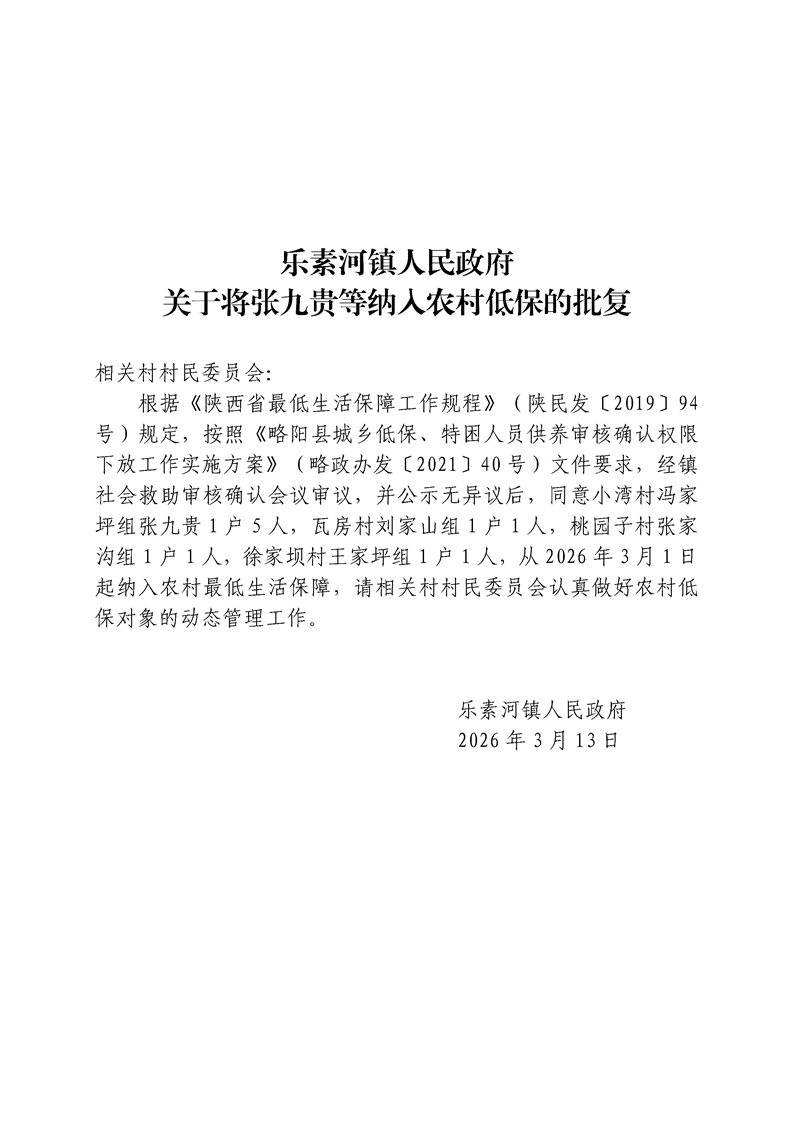 乐素河镇人民政府关于将张九贵等纳入农村低保的批复