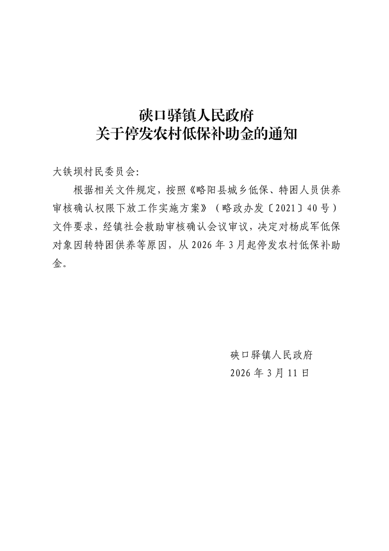 硖口驿镇人民政府关于停发农村低保补助金的通知