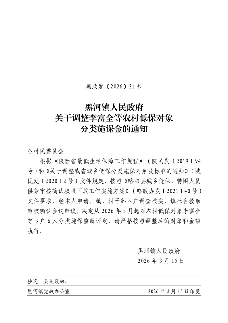 黑河镇人民政府关于调整李富全等农村低保对象分类施保金的通知
