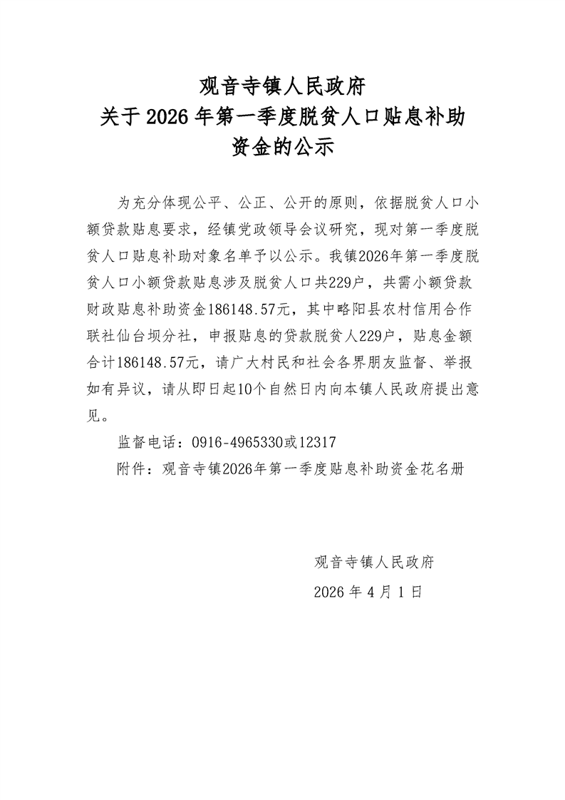 观音寺镇人民政府关于2026年第一季度脱贫人口贴息补助资金的公示