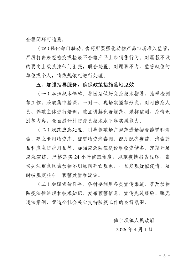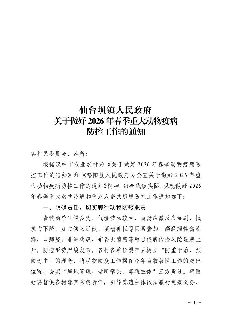 仙政发〔2026〕19 号仙台坝镇人民政府关于做好2026年春季重大动物疫病防控工作的通知